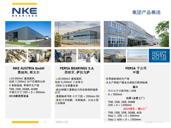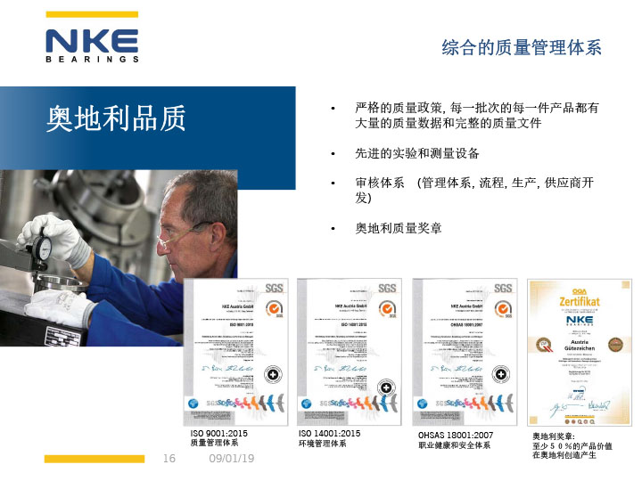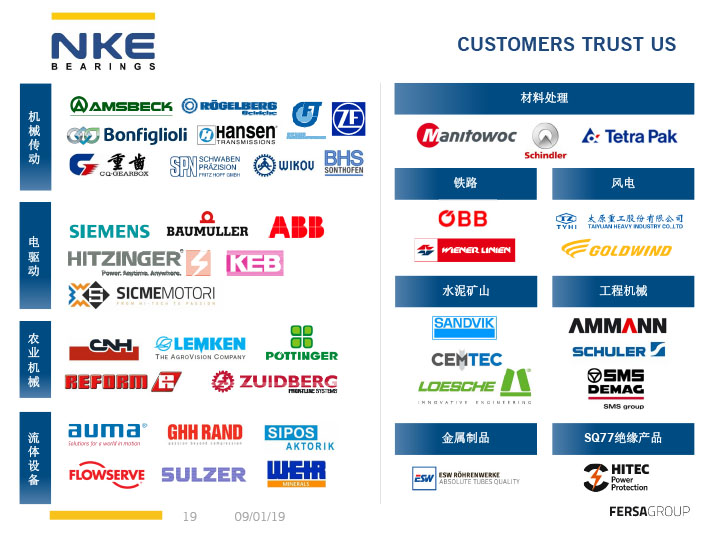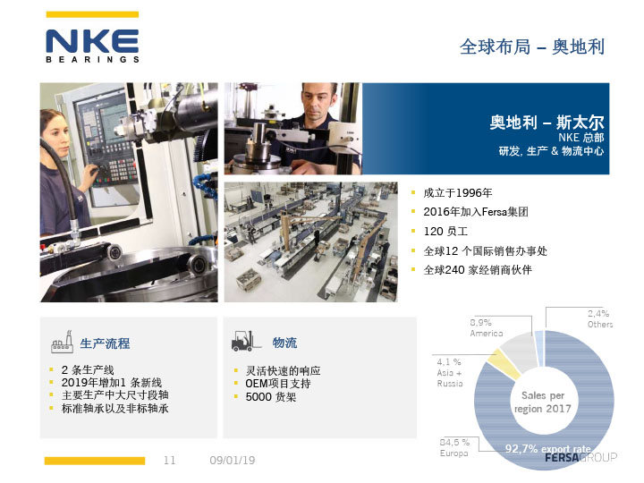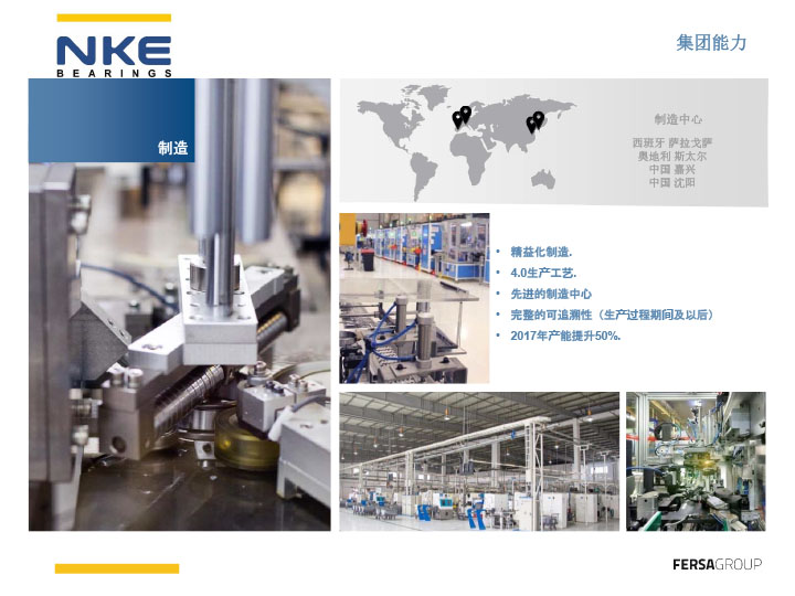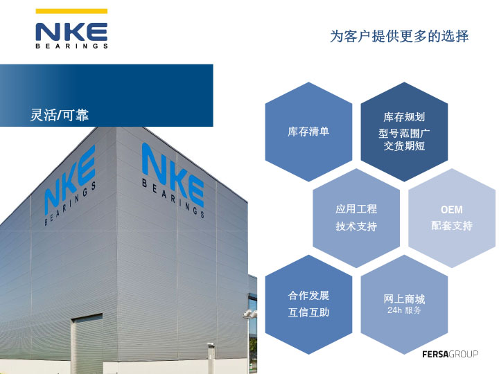 NKE AUSTRIA是优质轴承生产企业,于1996年由前斯泰尔滚动轴承厂(Steyr Wälzlager) 的资深管理人员成立,在短短二十余年内,NKE品牌已经在国际轴承市场上建立了一定的地位,成为被广泛认可的优质轴承品牌。除了供应各类工业应用的标准和特种轴承外,NKE还提供技术服务,如产品开发、应用技术、咨询顾问、技术文件和培训等等。