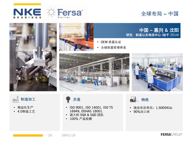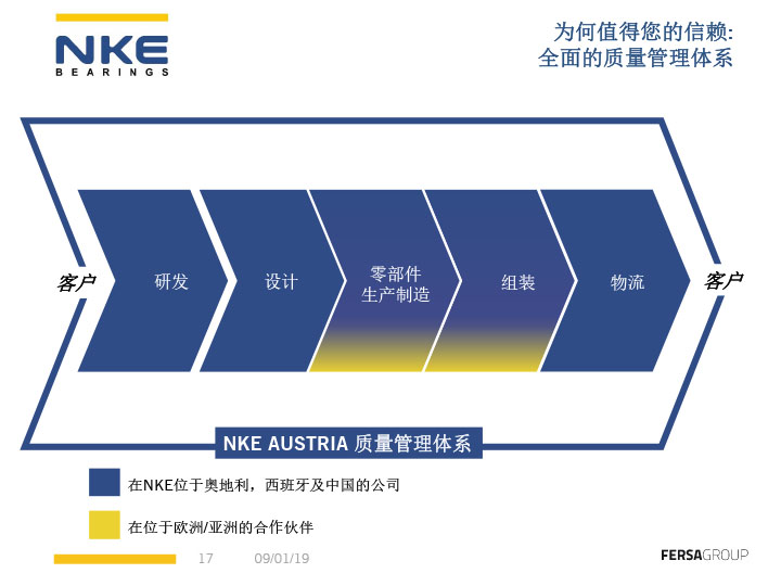 NKE的核心功能 —工程技术、产品研发、组件及轴承的最终处理、组装、品质控制、物流和市场营销 — 都集中在位于奥地利斯泰尔(Steyr) 的总部。此生产中心获得ISO 9001:2008国际质量管理体系、ISO 14001:2004国际环境管理体系及OHSAS 18001职业健康安全管理体系认证。NKE更因其卓越品质于2006年4月获颁奥地利优质产品标志(Austrian Quality Seal) 。